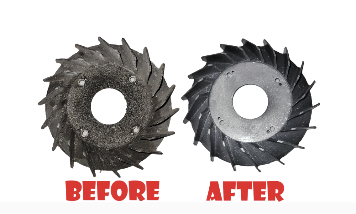 The process consists of blasting pressurized air, water, and fine glass beads at the mechanical part bringing it back to its original condition!