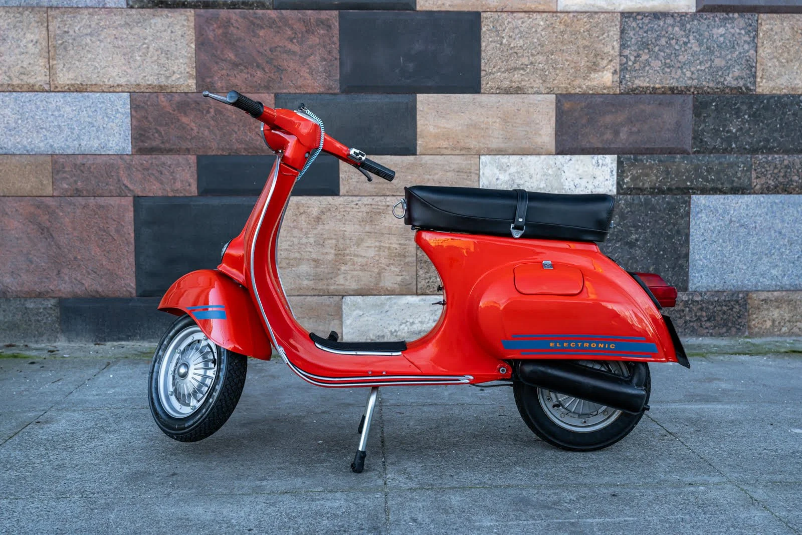 Rare and special first series T5 from Italy - Never sold in the states. Unique styling, true survivor in very clean overall condition. Features a unique sporty and powerful 5-port motor. A rare 1980’s classic in remarkable condition, restored several years ago and well kept since. Overall very clean and straight with Rossa paint and bodywork in good shape. Attractive and special for this model only instrument cluster showing only 34,226km (21,267 miles) believed accurate. Fitted with sturdy rack and color wheel discs. Mechanical condition is also very good and this sporty Vespa runs great. A real score for an enthusiast who enjoys lively performance and one of the best handling Vespa models. A gem!