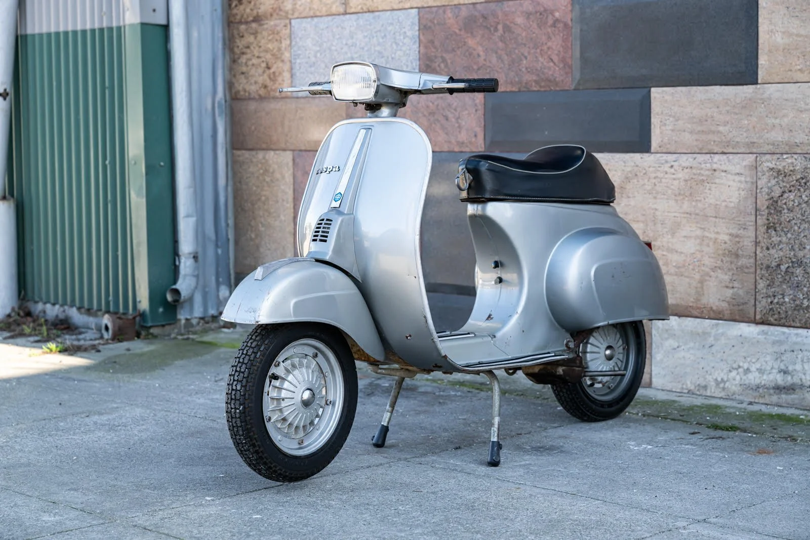 It was known for its racy look and square headlight, which distinguished it from earlier round-headlight Vespa 50 models. Features a 4-speed manual transmission, 9” wheels and tires and a sporty solo saddle. Overall condition is good and the engine is in good shape. Original silver paint finish makes a very upscale impression, showing some patina and a few minor scuffs and scratches. A clean classic ready for fun and urban adventures.
