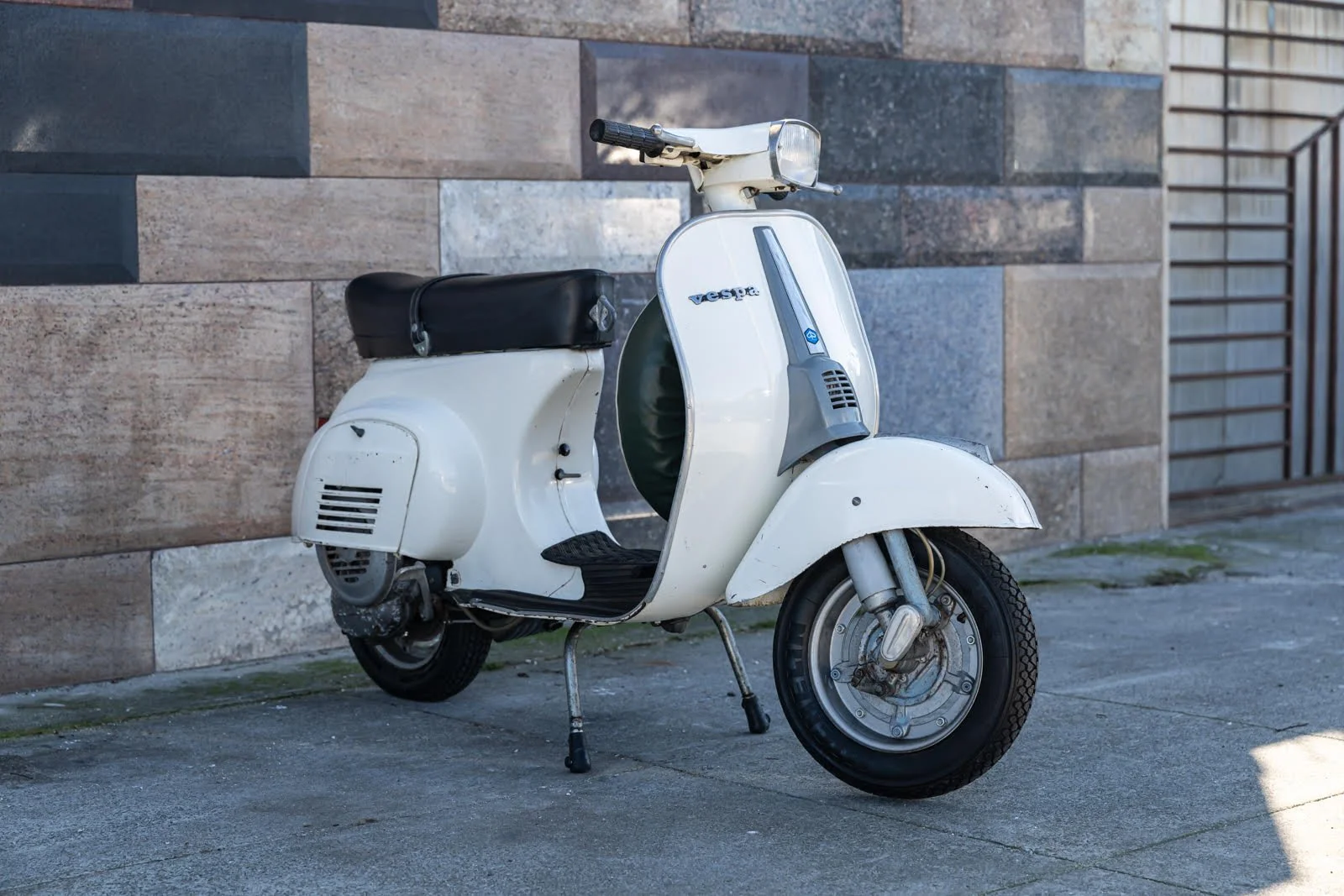 Styling features a racy look and square headlight, which distinguished it from earlier round-headlight Vespa 50 models. A spare tire is fitted to the legshield and protected by a vinyl cover. A rubber floor mat is a useful addition. Overall condition is good and the engine is in excellent running condition. Original bianco paint finish makes a very smart impression, showing some patina and a few minor scuffs and scratches. A clean classic ready for fun and urban adventures.
